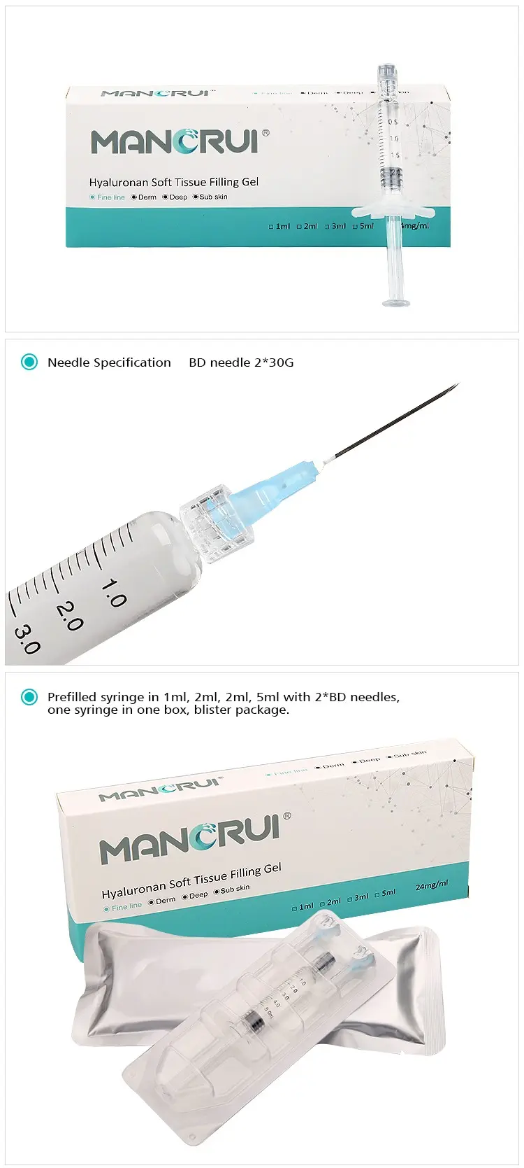 Manorui® Fine Line type is designed to treat fine or superficial lines and wrinkles. Use the product to smooth lines around the eyes, mouth, lips, on the forehead and upper face. The product integrates smoothly into the skin and should be injected superficially.