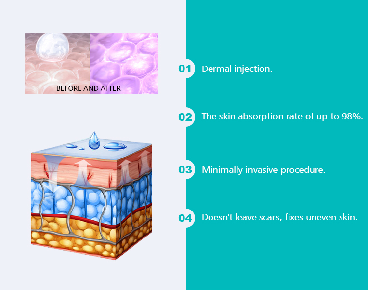Non cross linked meso HA is used for skin hydrate, anti aging, filling shallow layer wrinkles. I can use needle injection, also can inject by hyaluron pen, derma pen and microneedle.